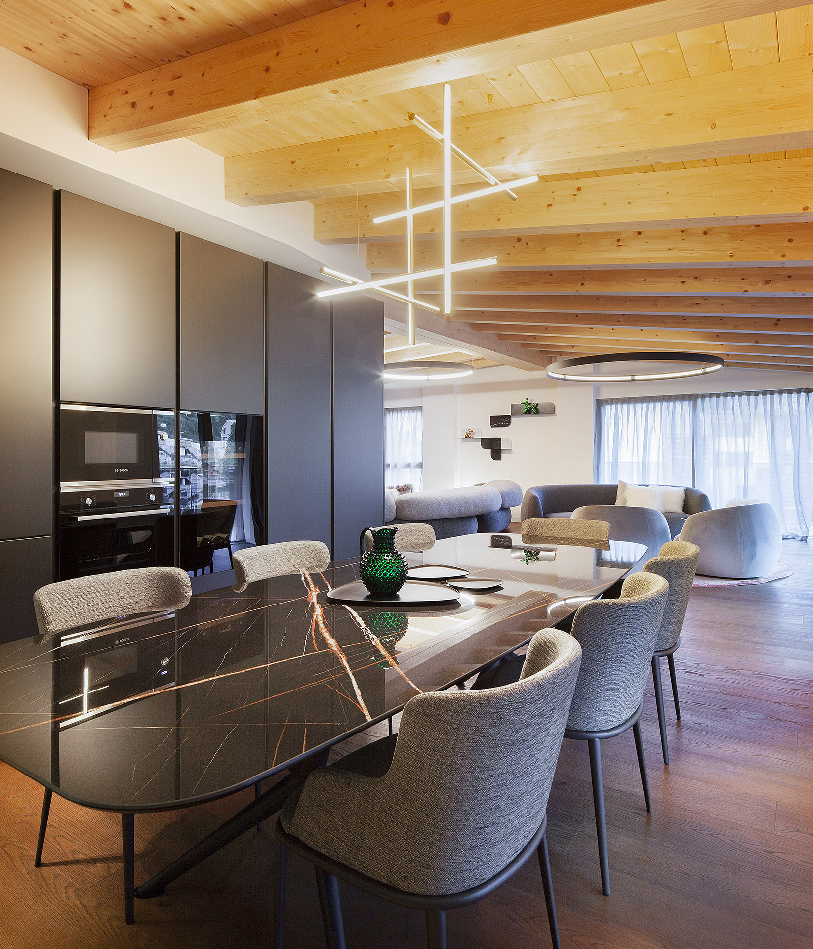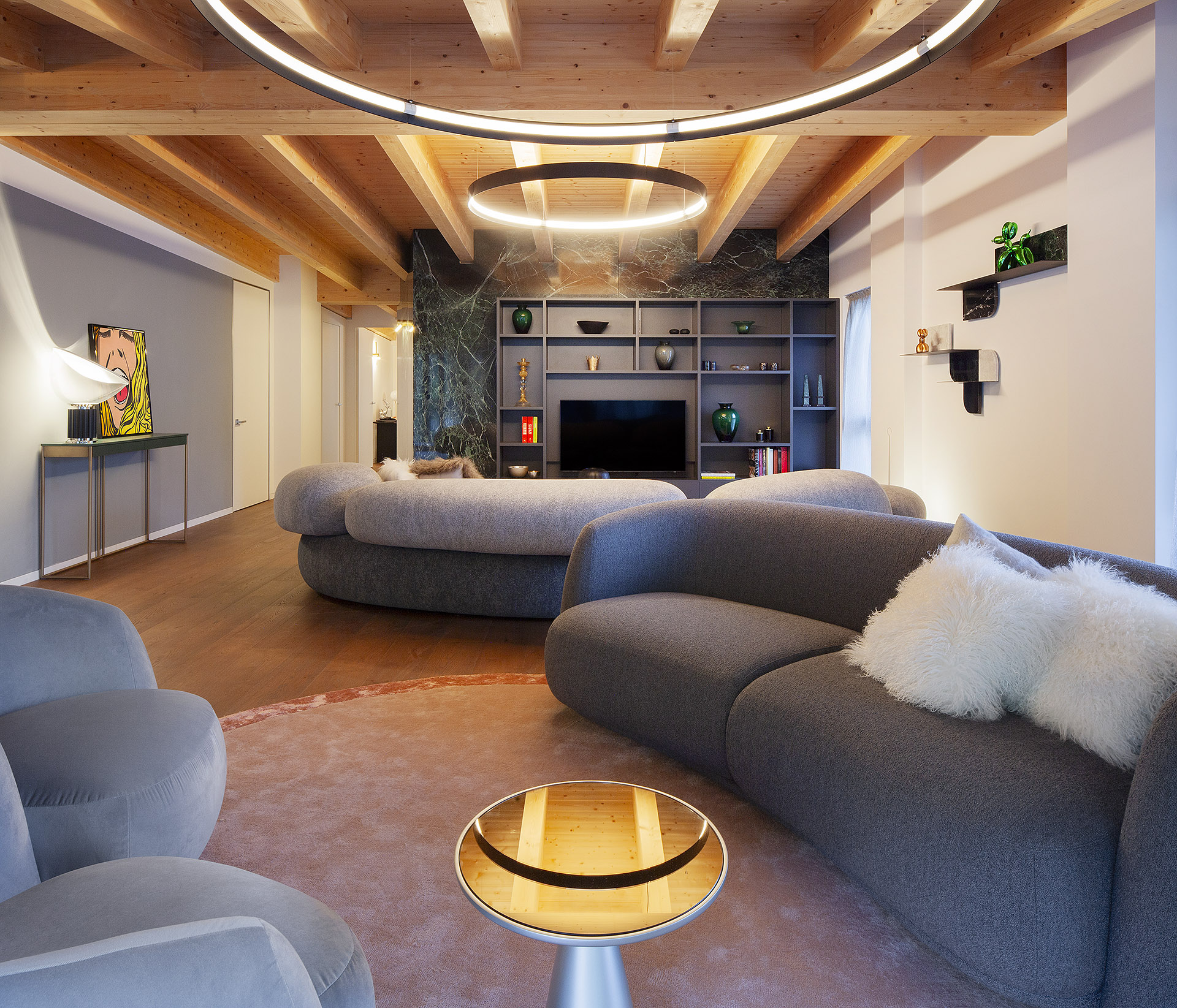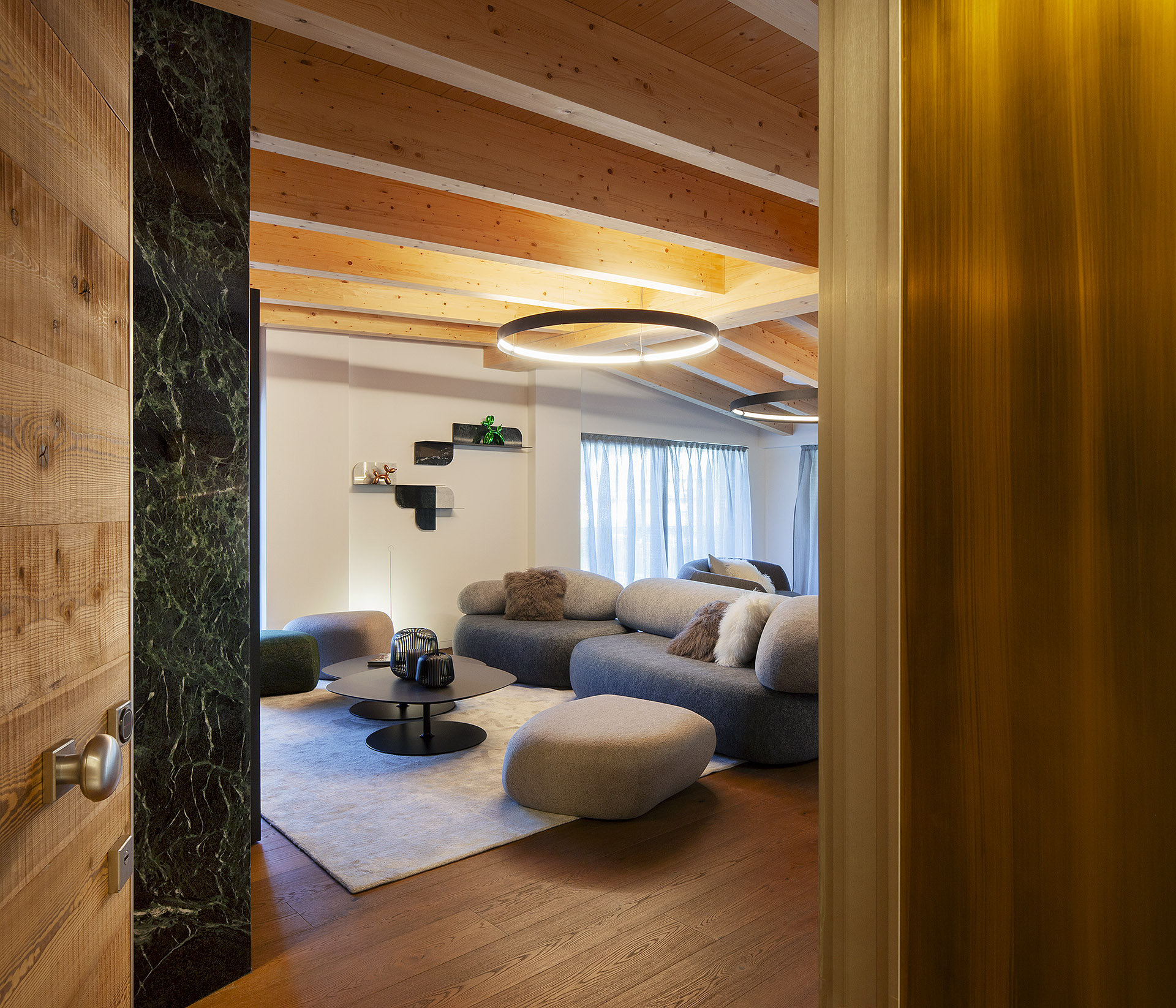 The result is a truly unique apartment, where contemporary elegance and subtle alpine influences blend into a measured, harmonious equilibrium—an interior designed to be lived in complete resonance with the natural beauty that surrounds it.