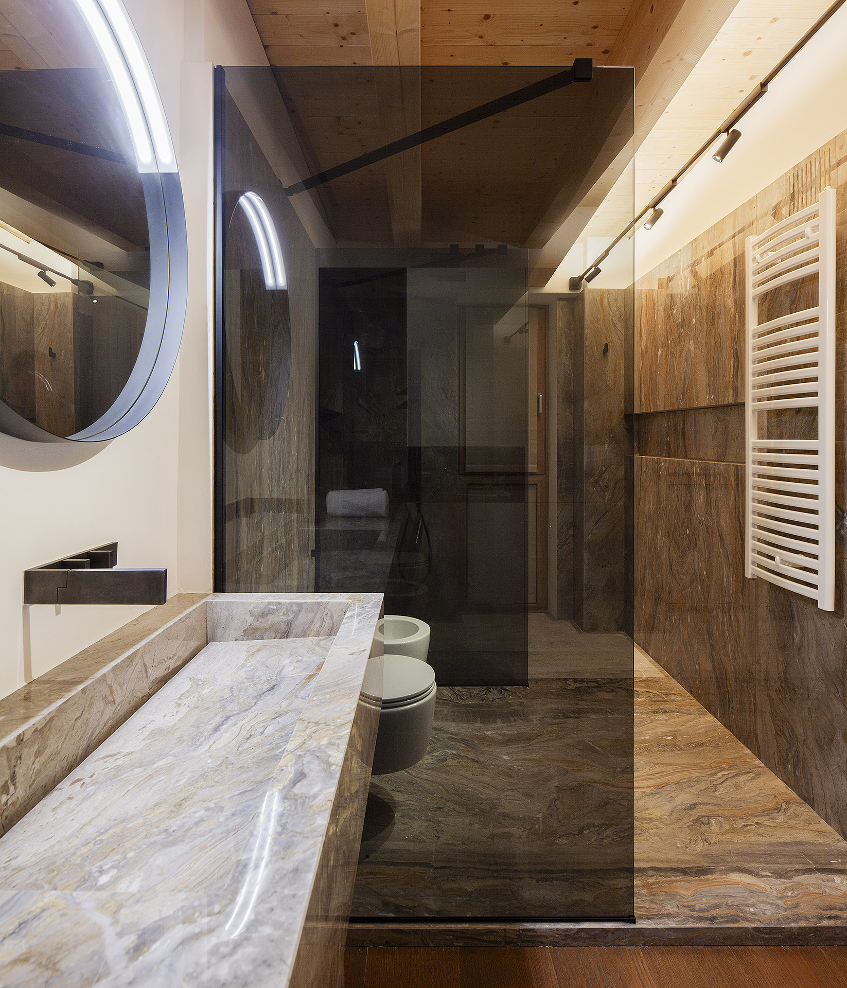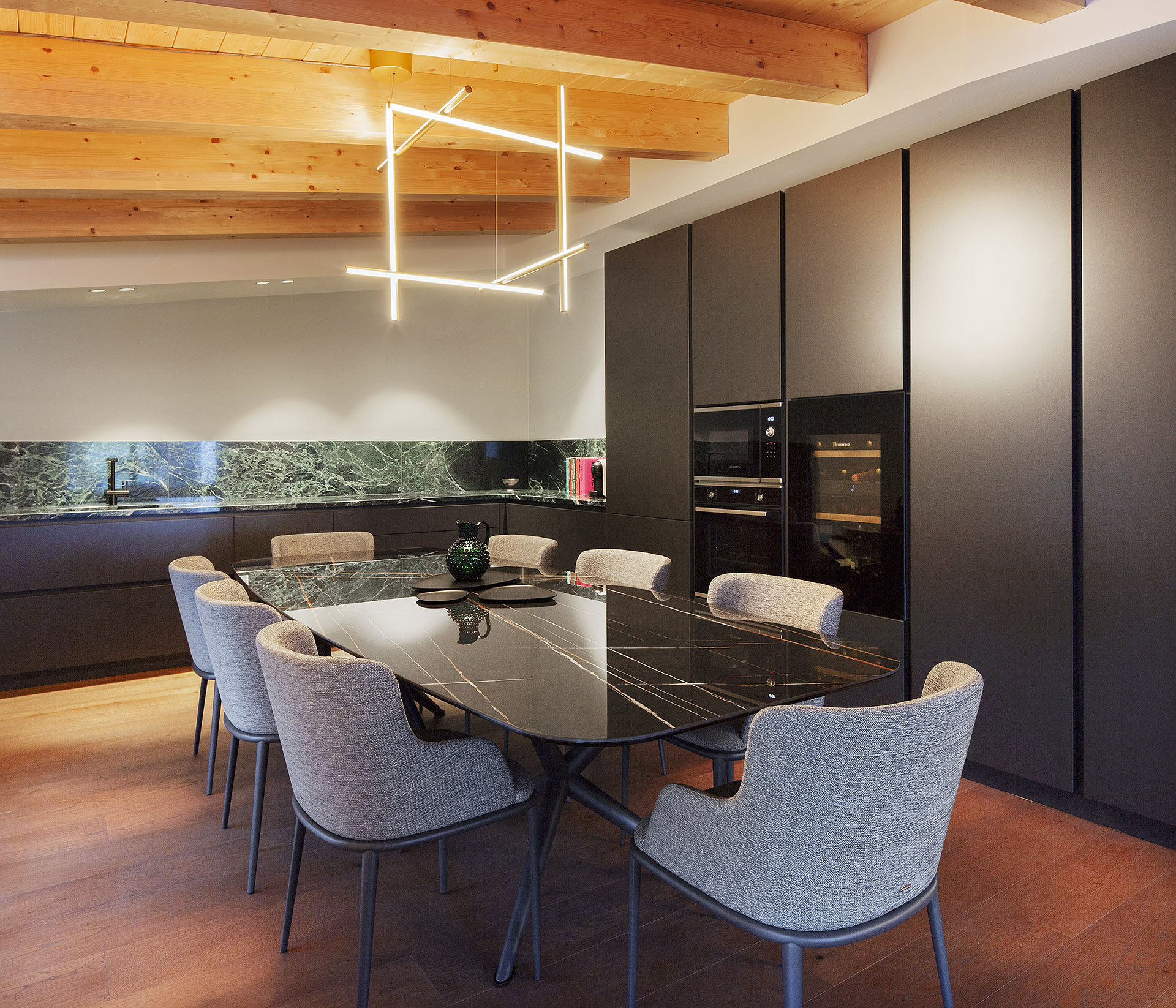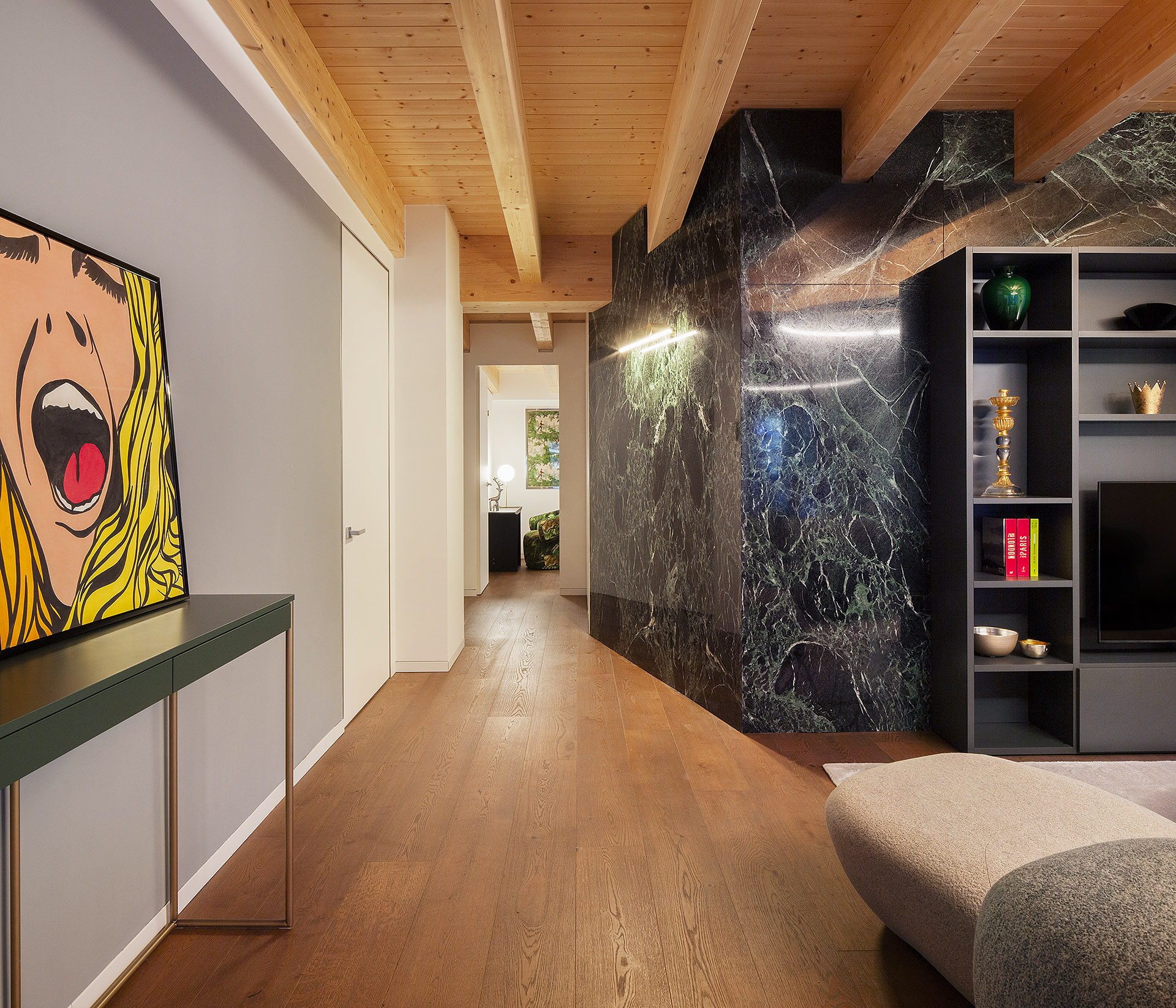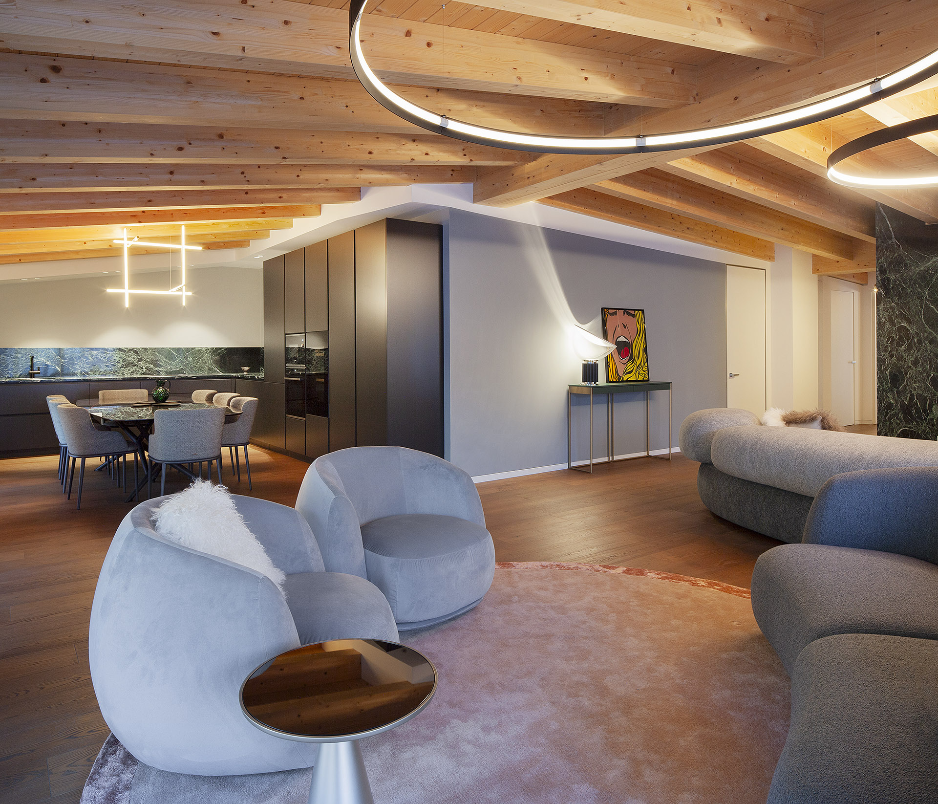 The result is a truly unique apartment, where contemporary elegance and subtle alpine influences blend into a measured, harmonious equilibrium—an interior designed to be lived in complete resonance with the natural beauty that surrounds it.