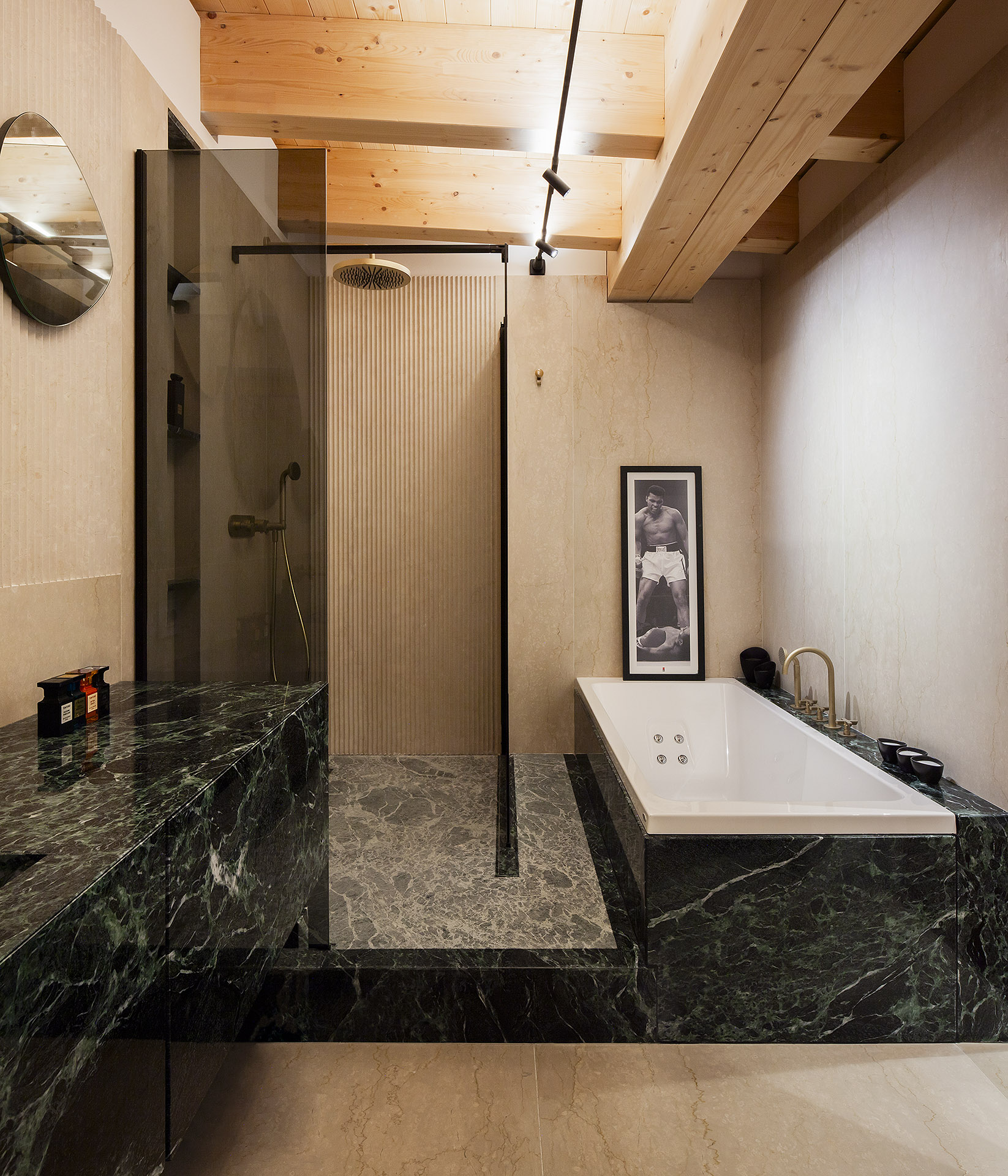 The expansive windows, opening onto snow-capped peaks and the quaint village below, act as living paintings that frame daily life. These extraordinary views—considered from the very beginning as a central design driver—have been amplified through the use of natural materials: warm-toned woods, marble and local stone surfaces, and textured fabrics. Each material choice engages in a dialogue with the alpine environment, creating an atmosphere that is both welcoming and refined.