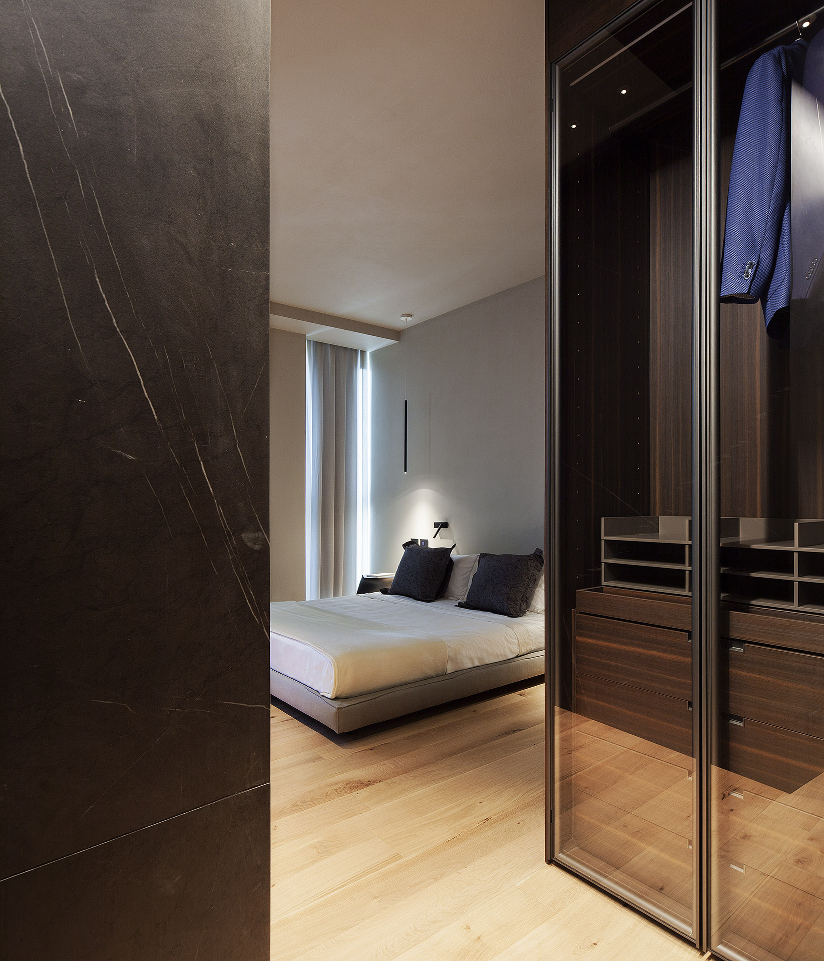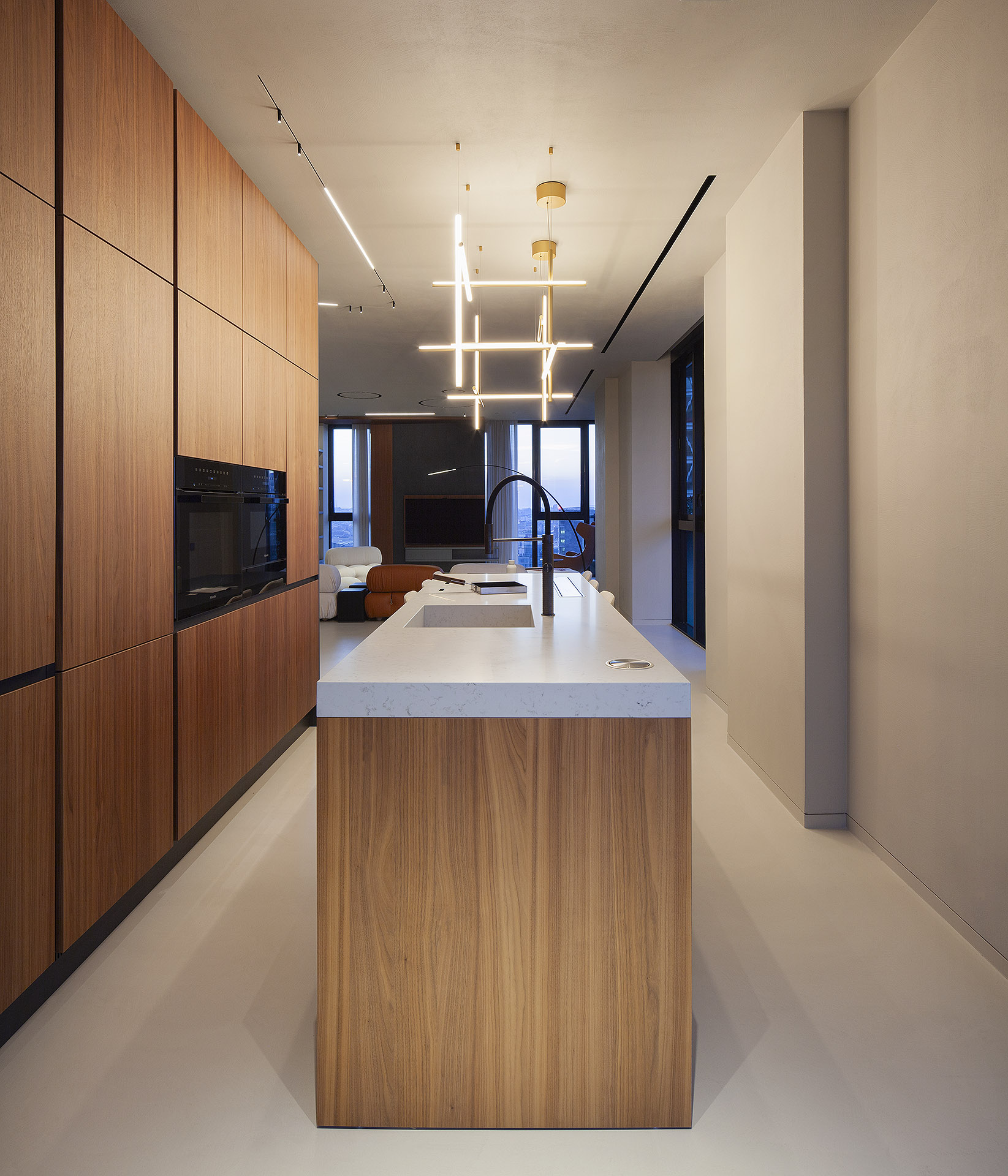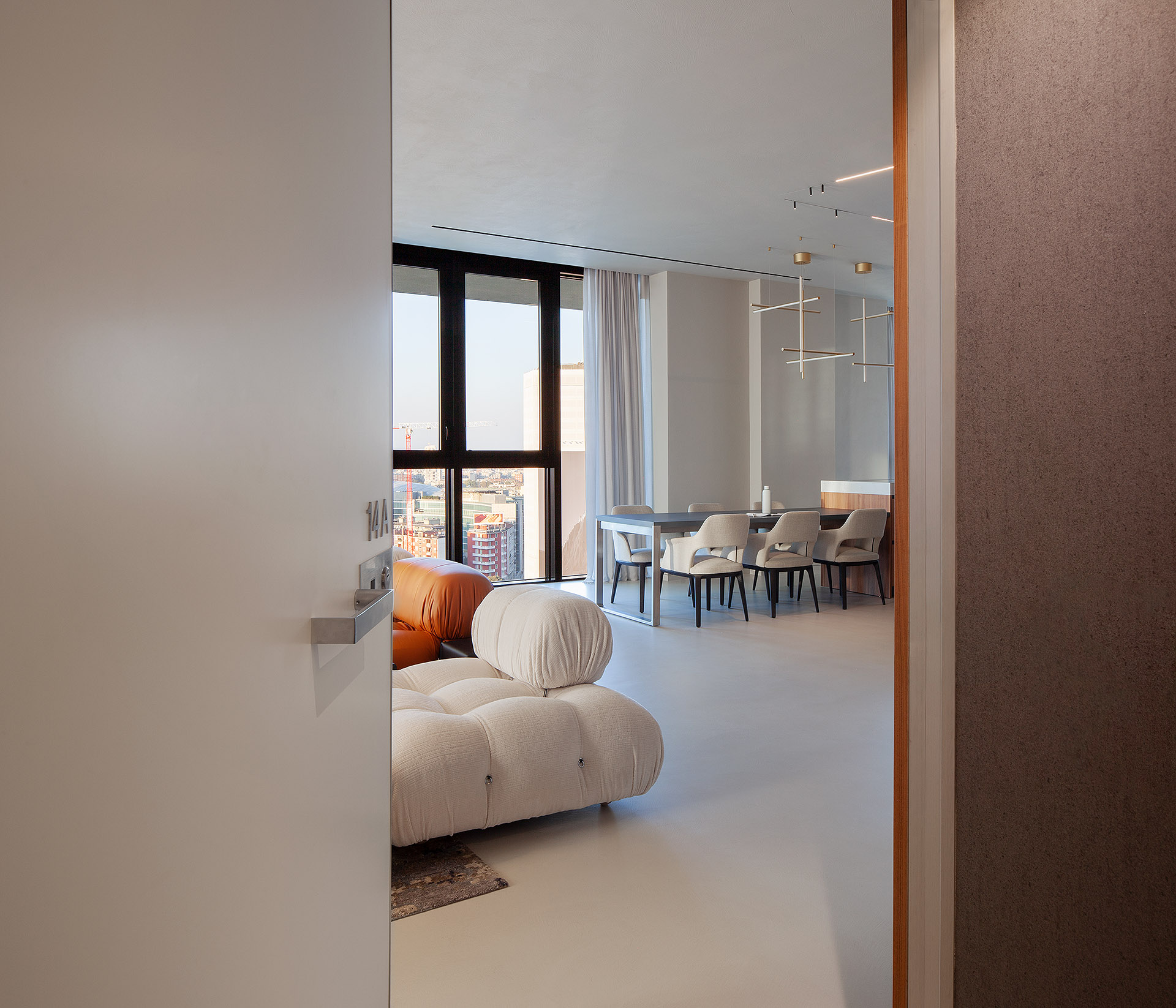 The interior design of this elegant apartment, located within one of Milan’s most contemporary residential towers, stems from the desire to create a space that is intimate, modern, and highly functional. The metropolitan verticality—its shifting lights, its constant rhythm—serves as the backdrop for a home conceived as a refuge, a place of calm and refined daily living.