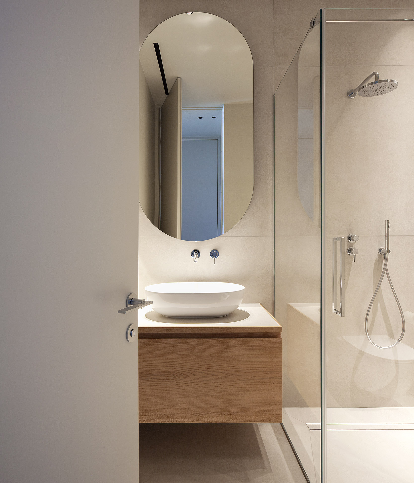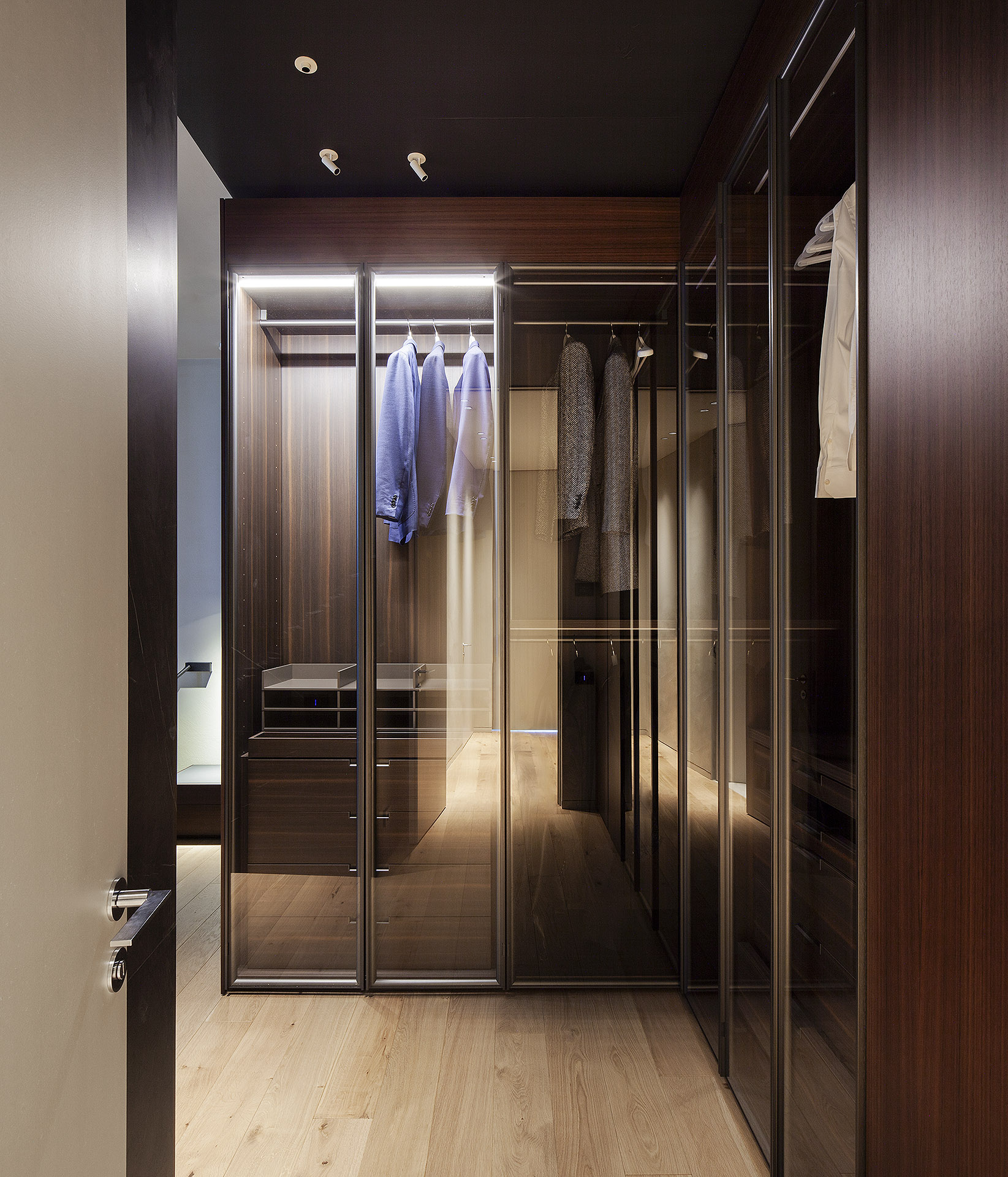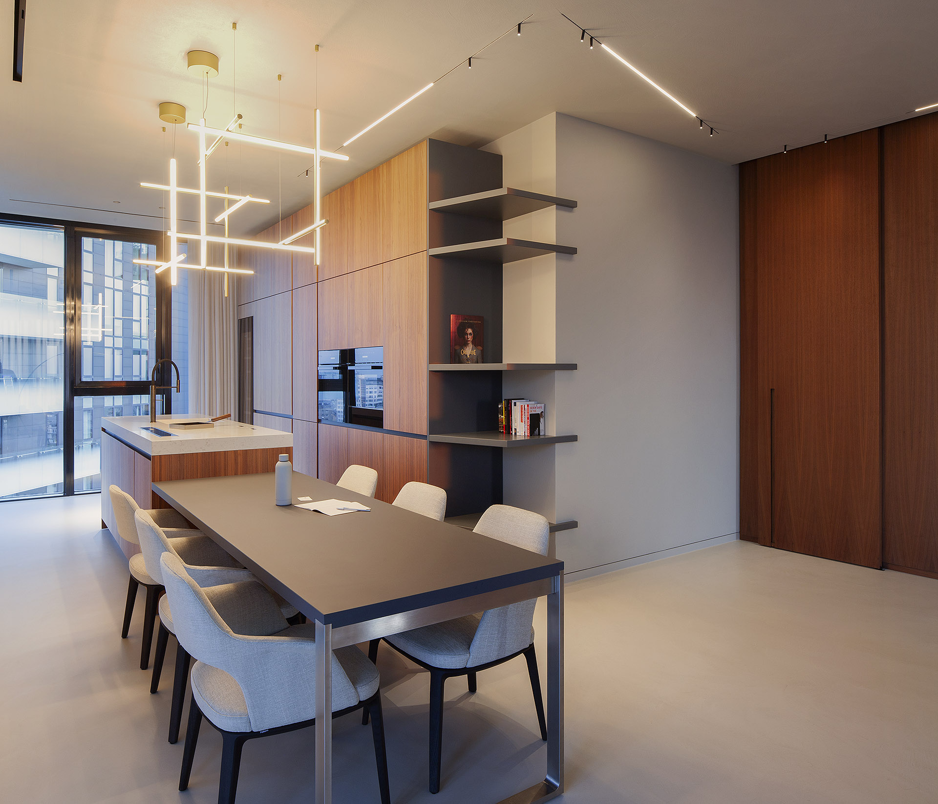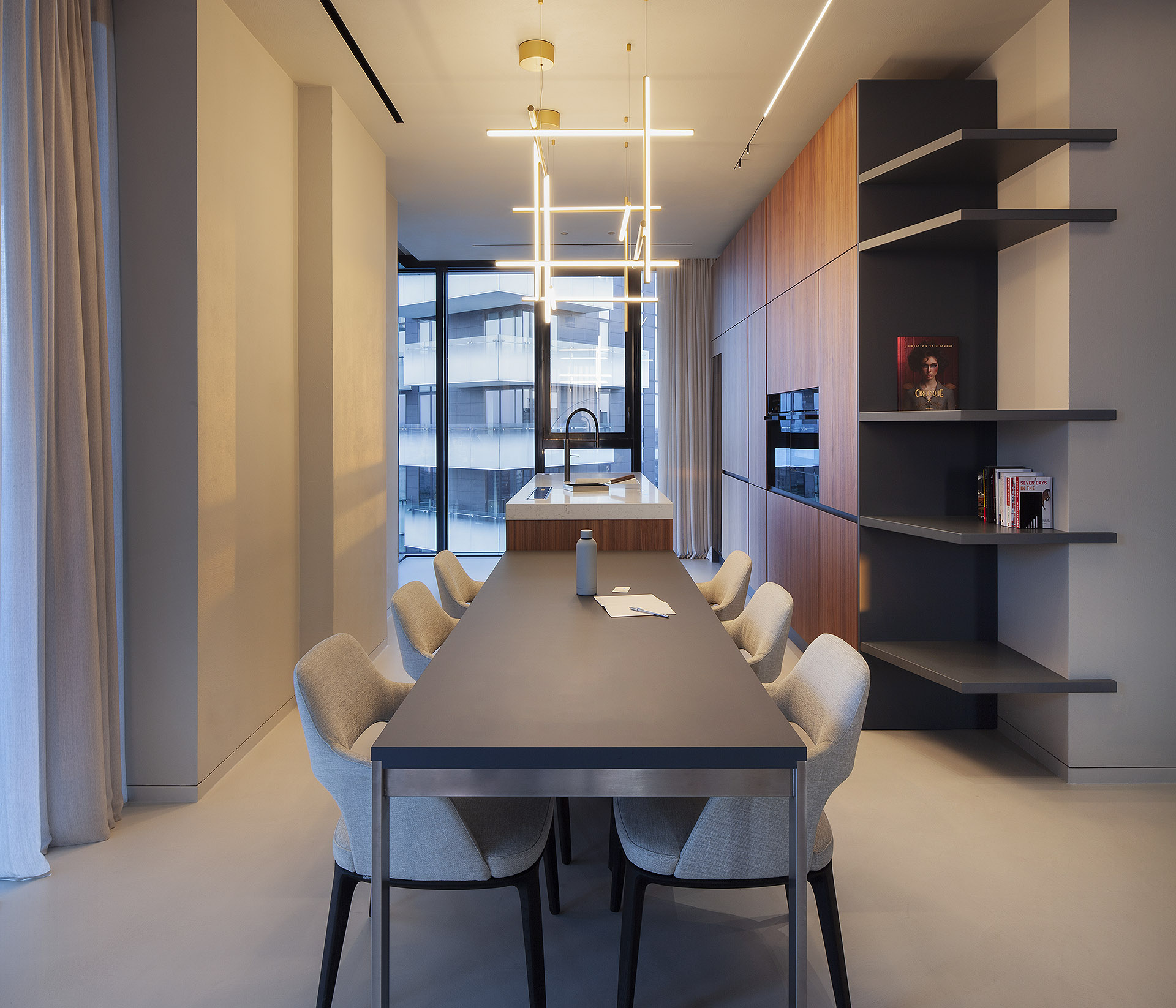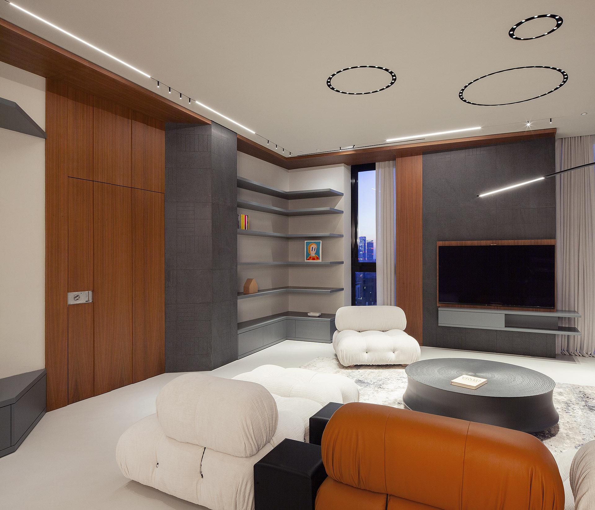 Artificial lighting plays a crucial role: subdued tones that soften surfaces, accent lights that highlight details and textures, and adjustable lighting scenarios that subtly transform the mood throughout the day. Nothing is left to chance—each junction, detail, and furnishing element contributes to an environment shaped with meticulous attention.