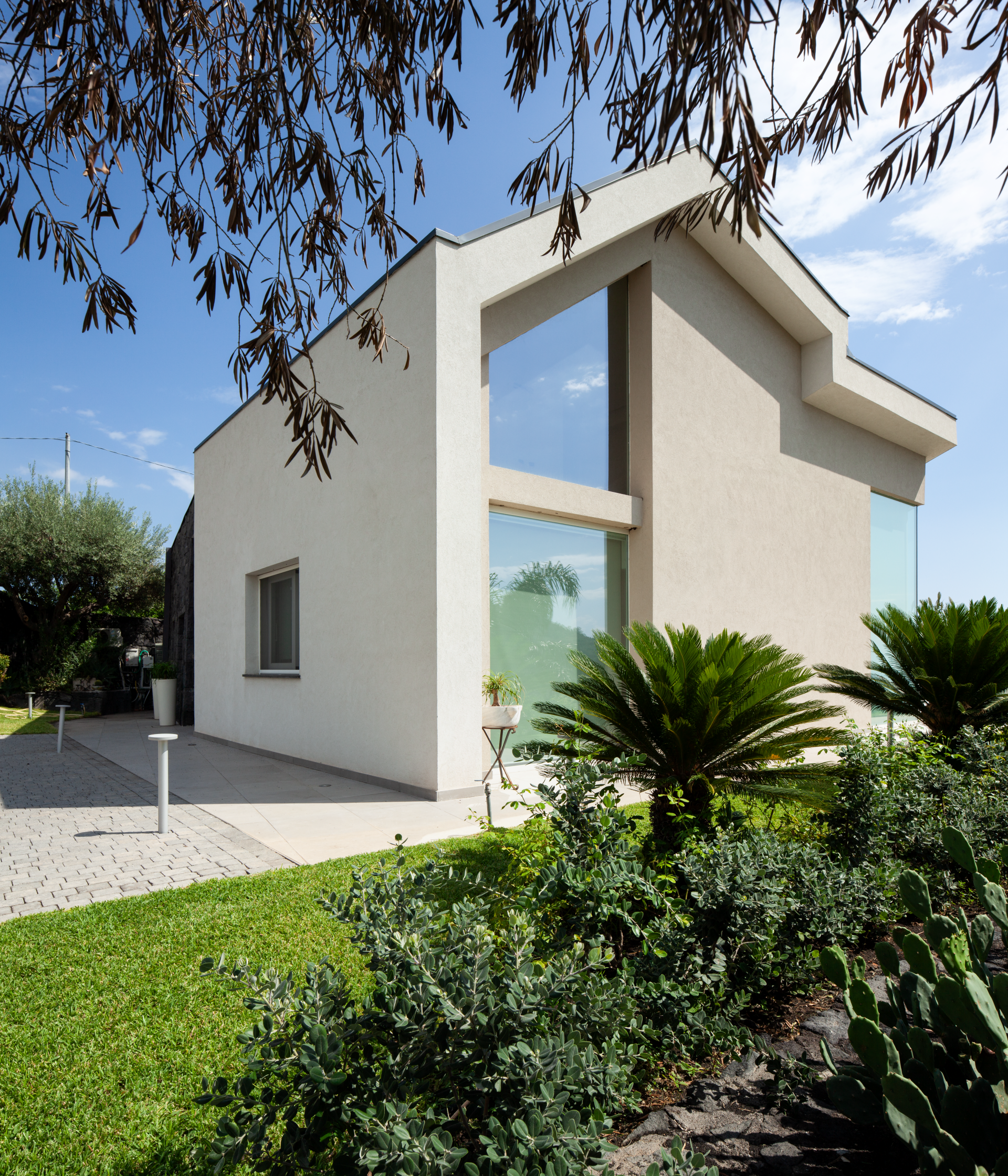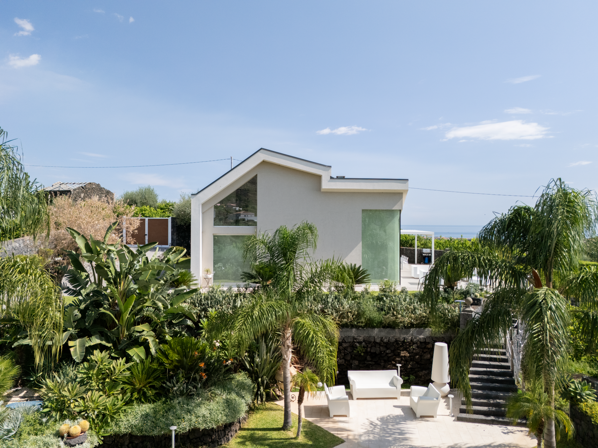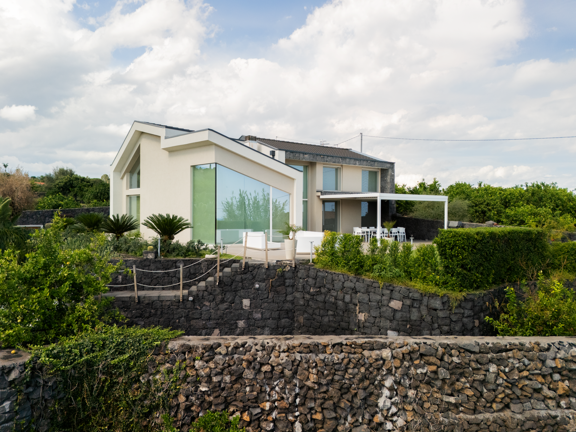 The resulting volume draws inspiration from the regular, monolithic forms of traditional lava-stone houses found throughout the Etnean coastline—structures that embody the history, materiality, and spirit of the territory. Yet this typological heritage is reinterpreted through a modern and more dramatic architectural language, characterized by clean geometries, strong material contrasts, and carefully positioned openings that frame views of the sea, the mountain, and the surrounding agricultural landscape.
