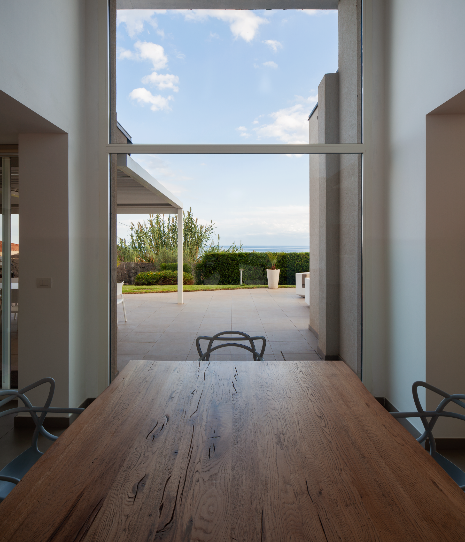 Nature is an integral part of the project: the lush garden, rich in local species, and the lemon grove that perfumes the air during the warmest hours of the day are not mere decorative additions but essential components of the overall composition. These outdoor spaces constantly interact with the architecture, creating sensory paths and quiet moments that amplify the Mediterranean character of the residence.